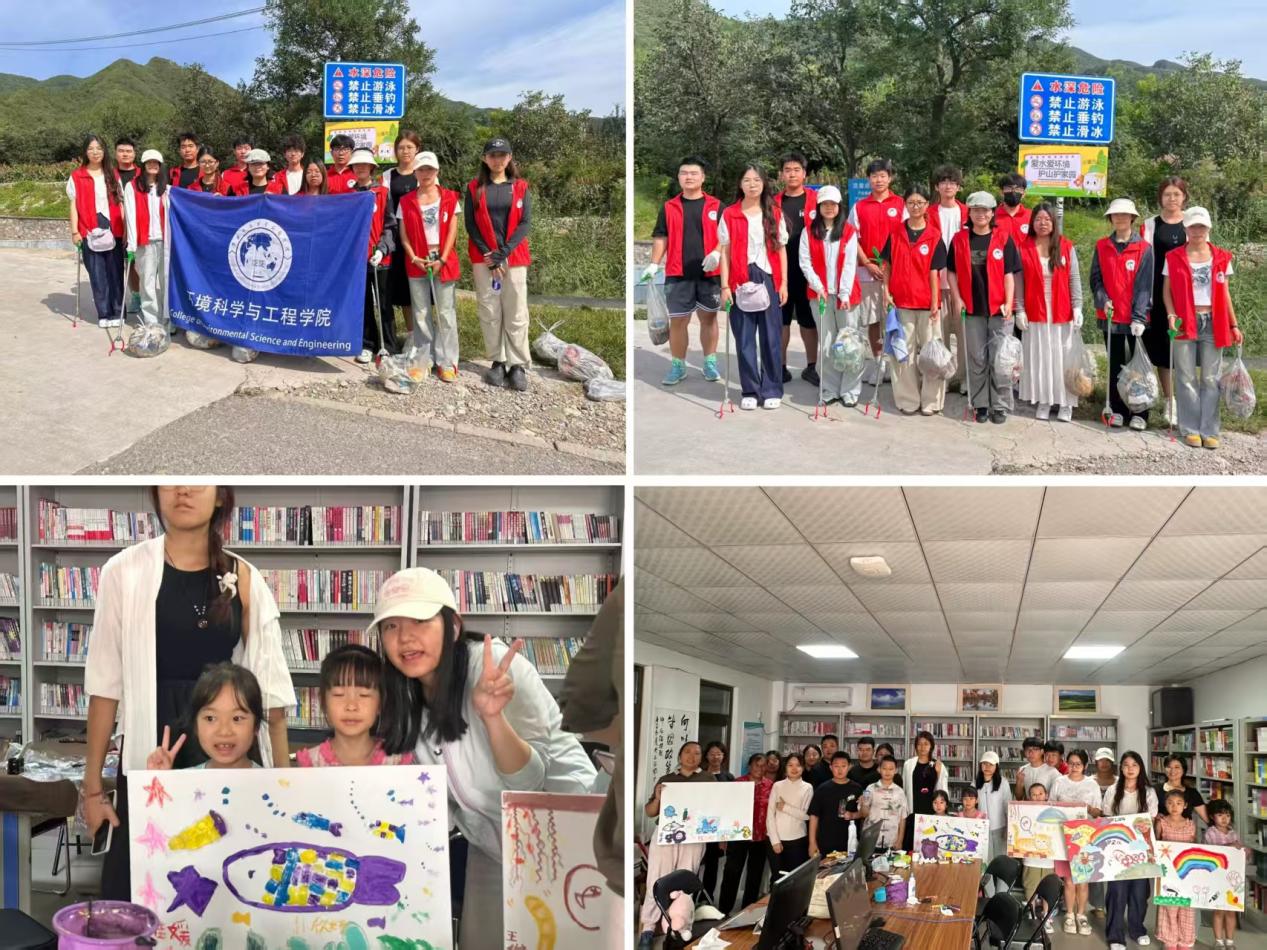 实践团成员与古将村小朋友共同完成废物利用环保画作、在古将村泉水取水口清理垃圾合照