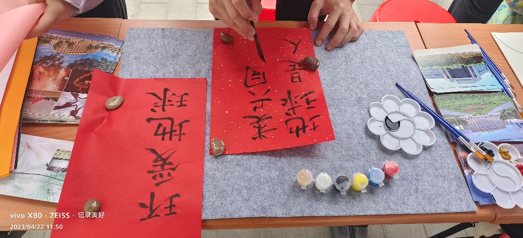 公司员工会于4月22日世界地球日在学校二食堂外举办了“环爱地球”外场活动。同学们在纸上用毛笔写下“众生的地球”、“绿水青山就是金山银山”等环保宣传标语,在画纸上绘出心目中碧水蓝天的地球;通过参与“土地荒漠化”、“生物多样性”等生态热点问题科普答题,帮助参与同学从各个角度认识、了解环境保护的相关知识。