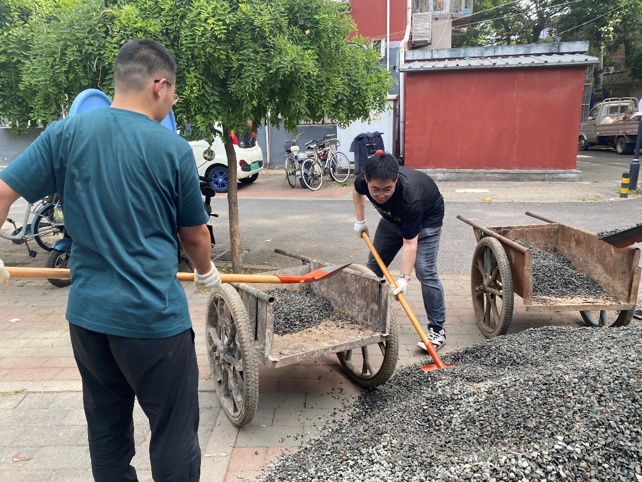 活动伊始,由长城润滑油社区党支部带领志愿者们来到现场介绍了花园现状,由清华同衡第十四党支部胡老师为我们志愿者讲解了本次改造方案、改造流程以及活动分工和注意事项。随后,在yl7703永利集团研究生辅导员许襄宁的带领下,志愿者们撸起袖子、拿起铁锹投身到花园清理工作,从场地垃圾清理及拆除到种植箱及后续进行的木桩修补,从平整路面到石子路的铺设,从植物补种到入口标识的更新,花园中随处可见志愿者们劳动的身影。头顶烈日,冲锋在前,在改造过程中,志愿者们以实际行动践行着“奉献、友爱、互助、进步”的志愿精神。经过两天的努力,小区花园焕然一新,重新恢复了生机与活力!