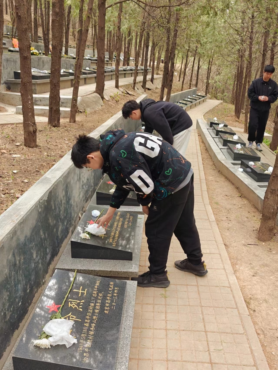 走进历史纪念馆内,仿佛穿越时空,回到那段充满激情与热血的岁月。展厅中战役场景逼真重现,革命先烈雕像神情庄严,大义凛然,他们有的弯着腰,拿着武器,随时可以给敌人沉重的打击,有的拿着冲锋号,吹着胜利的凯歌。一件件满是历史气息的革命老物件,一张张真实的历史资料画面,同学们观看了展馆内陈列的抗战时期详实的历史资料、珍贵文物,身临其境地感受当年党和人民为保家卫国开展的各种战争的历史场景,重温了中国人民各种战争的历史和过程,感受到了先烈们峥嵘的革命岁月和英勇斗争的精神气魄。烈士陵园内,松柏苍翠环绕,气氛庄严肃穆。一座烈士纪念碑在苍松翠柏中巍然矗立,阳光灿烂,穿透密林洒在碑石上,“昌平烈士纪念碑”的碑文更加熠熠生辉。同学们神情肃穆,为长眠于此的英烈献上白花,向革命烈士致以最崇高的敬意,寄托最深切的哀思。斯人已逝,但先烈们的英雄气概浩然长存,先烈们的伟大精神将薪火相传。