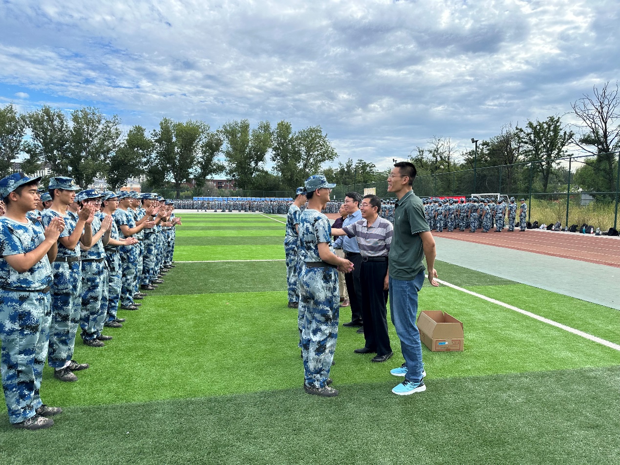 汪黎东对在炎炎烈日中坚持参训的同学们致以亲切的慰问,对同学们在训练中展现出的高昂士气给予高度肯定。希望同学们通过军训,能够锤炼吃苦耐劳的意志,增强集体观念和纪律意识,提升自信心和责任感,展现出老员工昂扬向上的精神状态;身体是革命的本钱,希望同学们在刻苦训练的同时,也要注意自己的身体健康。随后,四位领导向教官和同学们送上了中秋佳节的祝福,并发放了月饼和运动饮料。